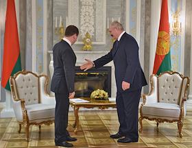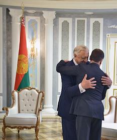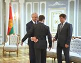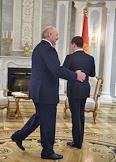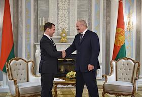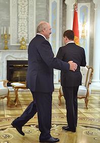 Рабочая поездка председателя правительства Дмитрия Медведева в Минск. Президент Белоруссии Александр Лукашенко (слева) во время встречи с председателем правительства России Дмитрием Медведевым (справа).