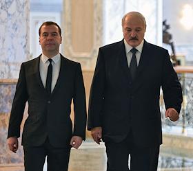 Рабочая поездка председателя правительства Дмитрия Медведева в Минск. Председатель правительства России Дмитрий Медведев (слева) и президент Белоруссии Александр Лукашенко (справа) во время встречи.