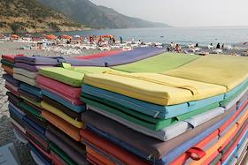 Турция. Жанровая фотография. Матрасы для лежаков на пляже у моря.