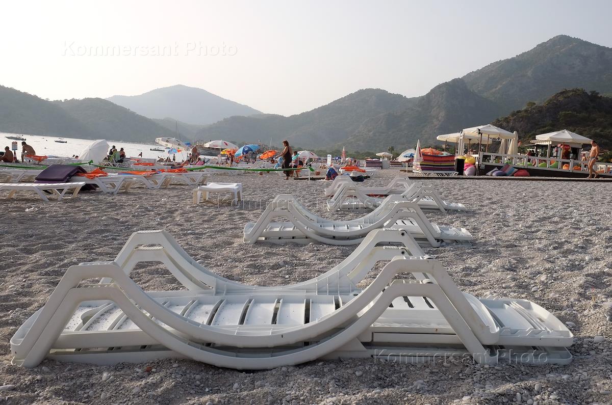 Турция. Жанровая фотография. Лежаки и зонтики на пляже у моря.