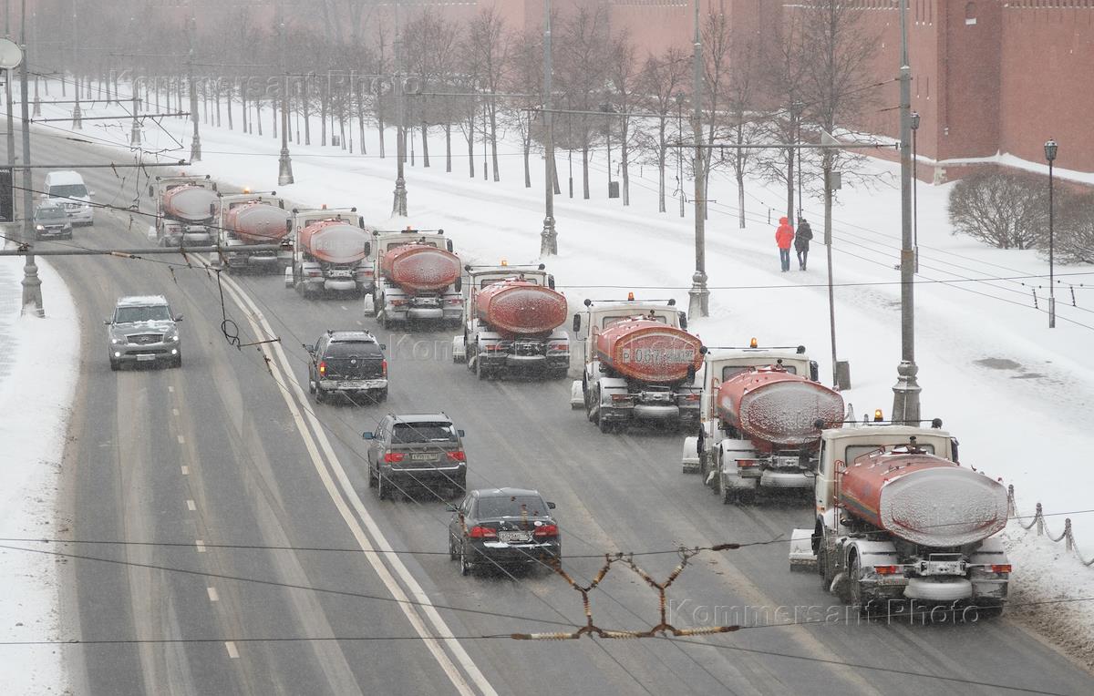 Жанровая фотография. Колонна снегоуборочной техники во время уборки снега на Кремлевской набарежной.