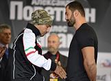 Боксер Джакоббе Фрагомени (Италия) (слева) и российский боксер Рахим Чахкиев (справа) во время официальной процедуры взвешивания в московской Академии бокса "Boxing & Gym".