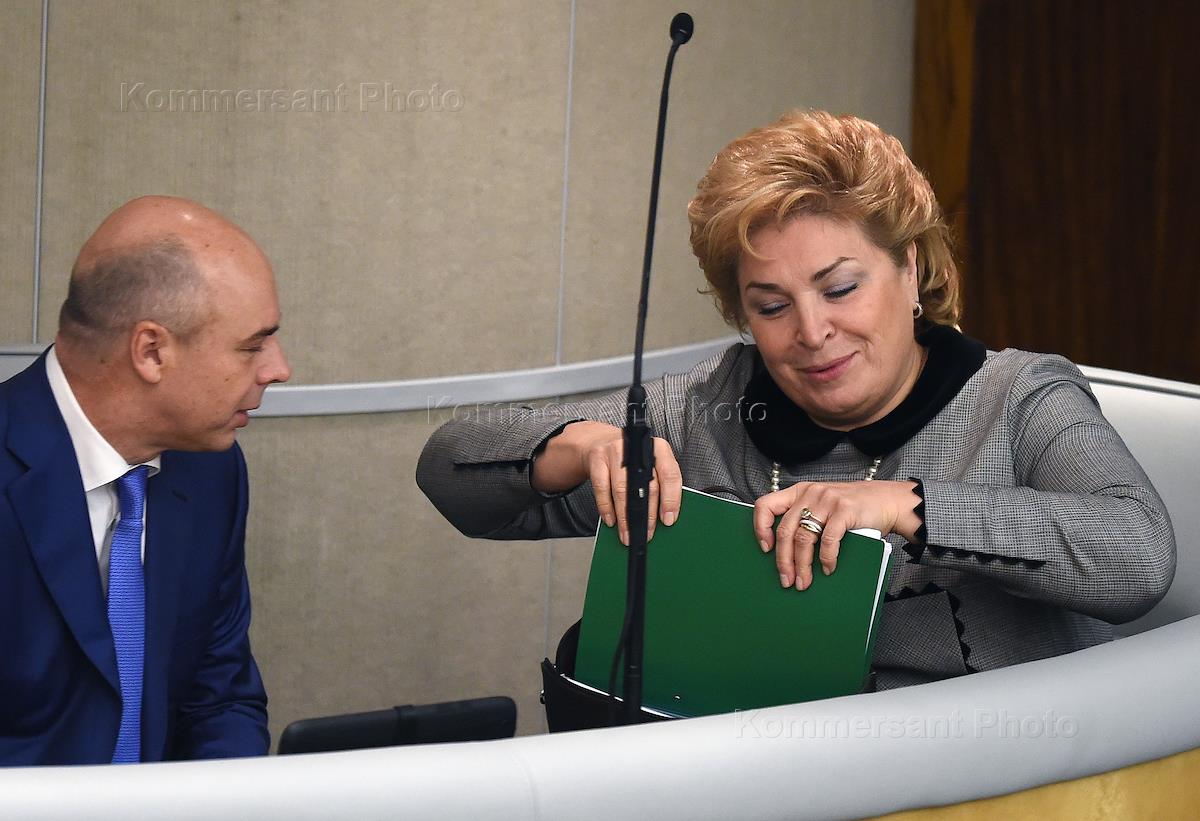 Министр финансов России Антон Силуанов (справа) и первый заместитель министра финансов России Татьяна Нестеренко (слева) во время пленарного заседания Государственной думы России.