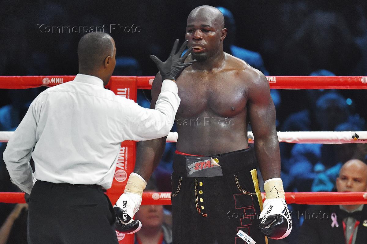 Боксер из Камеруна Карлос Такам (справа) во время поединка за титул WBC Silver в тяжелом весе с российским боксером Александром Поветкиным. Бой прошел на арене ГЦКЗ "Россия" в Лужниках.