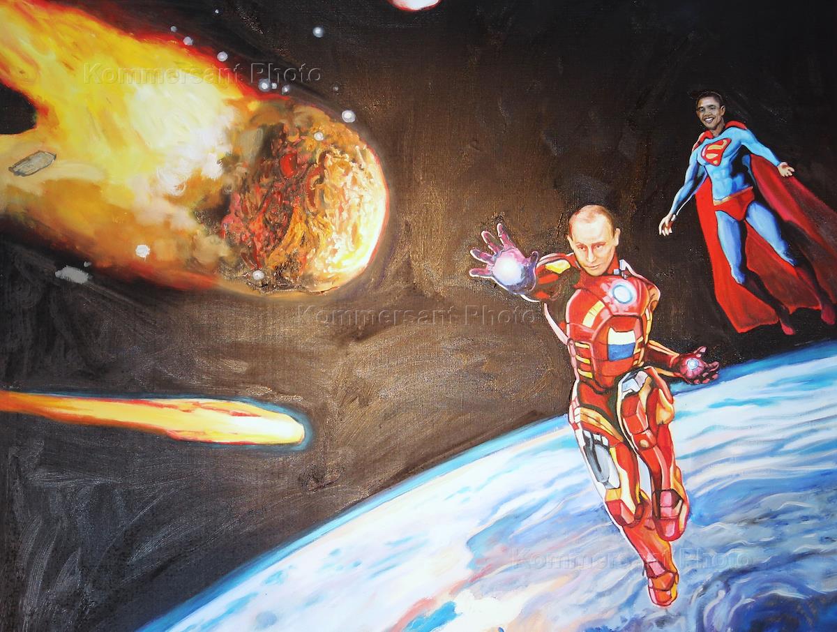 Работа художника Алексея Сергиенко из серии портретов президента России Владимира Путина в стиле поп-арт под названием "Добрейшей души человек". "Путин и Обама - супермены в космосе".