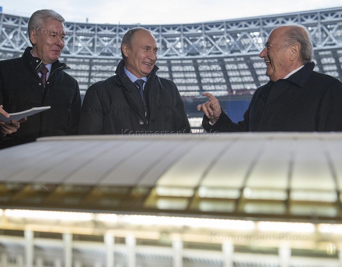 Слева направо: президент России Владимир Путин, президент Международной федерации футбола (ФИФА) Йозеф Блаттер и мэр Москвы Сергей Собянин во время посещения Большой спортивной арены "Лужники" ознакомились с ходом ее реконструкции, в связи с предстоящим матчем открытия одного полуфинала и финала Чемпионата мира по футболу - 2018.