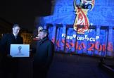 Церемония представления оргкомитетом "Россия-2018" официальной эмблемы Чемпионата мира по футболу 2018 года. Проекция на здание Государственного академического Большого театра (ГАБТ). Лучший футболист мира 2006 года Фабио Каннаваро (слева) и генеральный директор оргкомитета "Россия-2018" Алексей Сорокин (справа) во время церемонии.