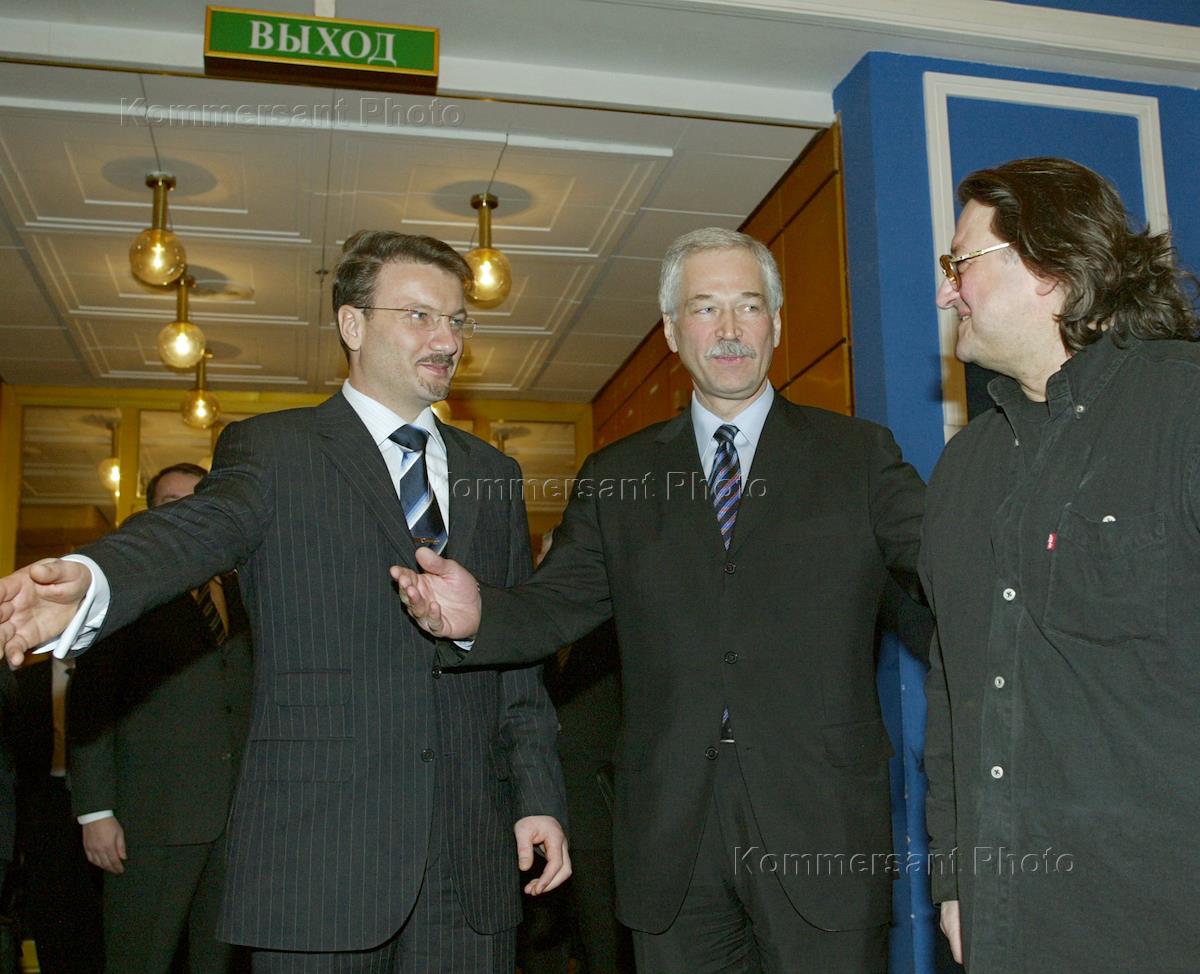 Министр России по экономическому развитию и торговле Герман Греф (слева), министр внутренних дел (МВД) России Борис Грызлов (в центре) и певец и композитор Александр Градский (справа) перед началом совместного заседания коллегий Минэкономразвития и МВД России. Заседание состоялось в здании Российской Академии наук (РАН).