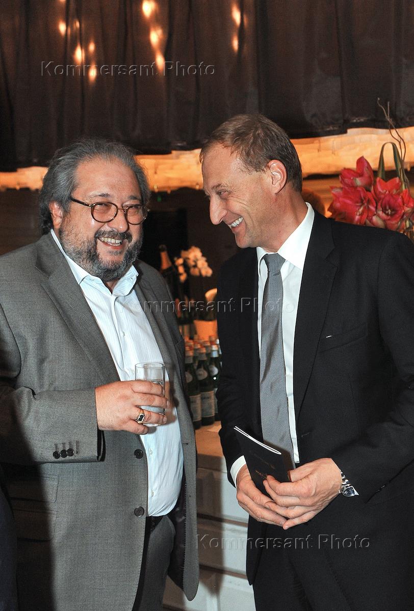 Президент Московского международного дома музыки Владимир Спиваков (слева) и генеральный директор Сотбис Россия и СНГ Михаил Каменский (в центре) на торжественном ужине, посвященный столетию винтажа Moet&Chandon 1914 года и аукцион в поддержку Международного благотворительного фонда Владимира Спивакова. Ужин прошел в ресторане Les Mens par Pierre Gagnaire.