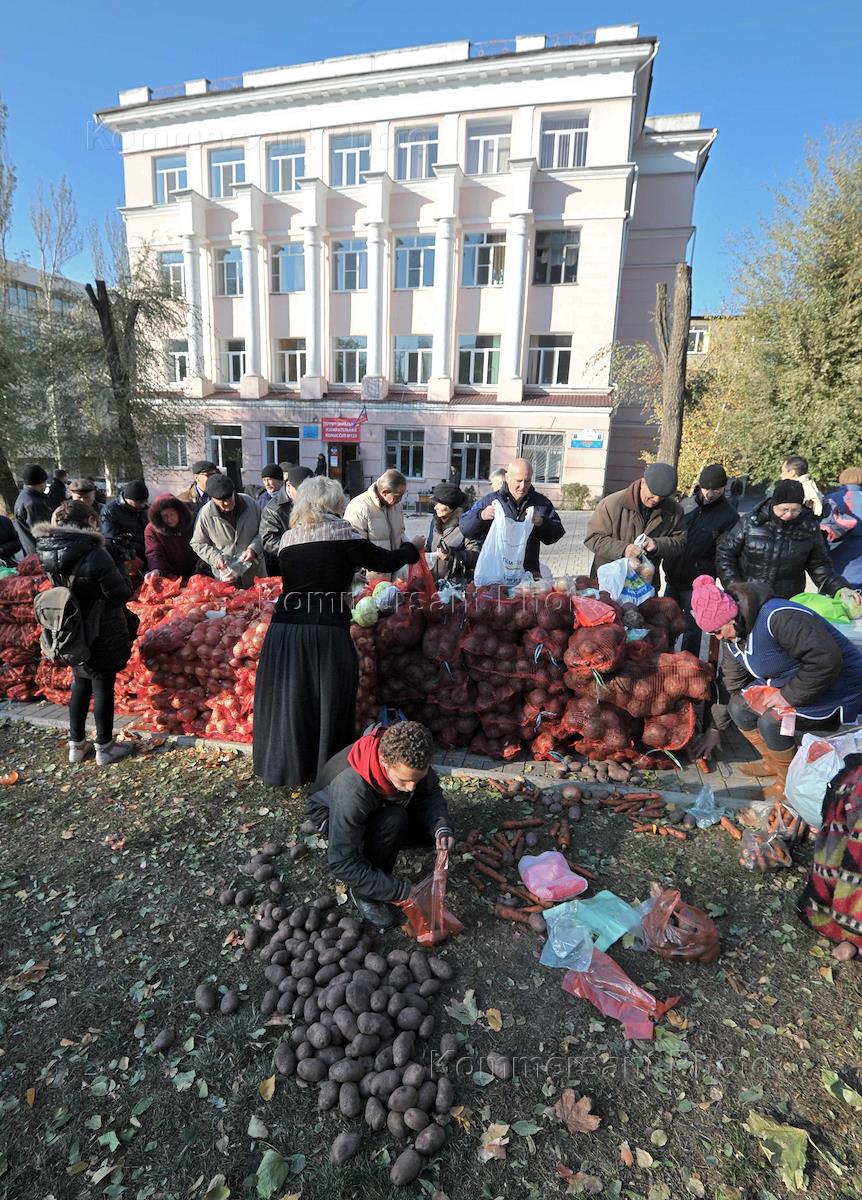 Выборы главы ДНР и депутатов Народного Совета республики. Жители Донецка на социальной продуктовой ярмарке перед избирательным участком № 125.