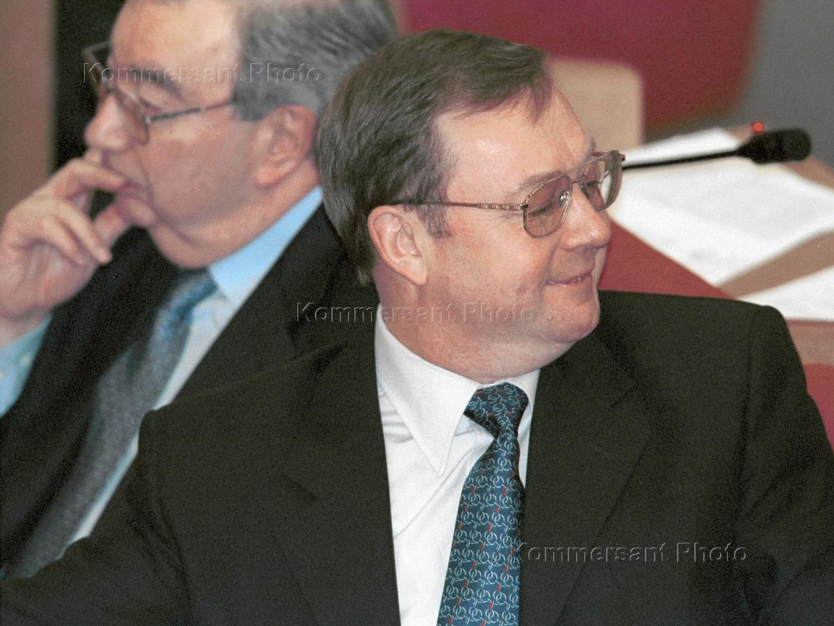 Factherland-All Russia Duma faction leader Eugeny Primakov (left) and Counting Chamber Chairman Sergei Stepashin (right) during a Duma session.