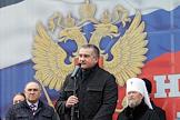 День народного единства. Праздничные мероприятия в Симферополе. Митинг у здания Государственного совета Республики Крым. Председатель Госсовета Республики Крым Владимир Константинов (в центре) и митрополит Симферопольский и Крымский Лазарь (справа) во время митинга.