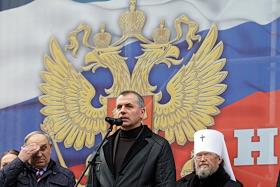 День народного единства. Праздничные мероприятия в Симферополе. Митинг у здания Государственного совета Республики Крым. Глава Республики Крым Сергей Аксенов (в центре) и митрополит Симферопольский и Крымский Лазарь (справа) во время митинга.