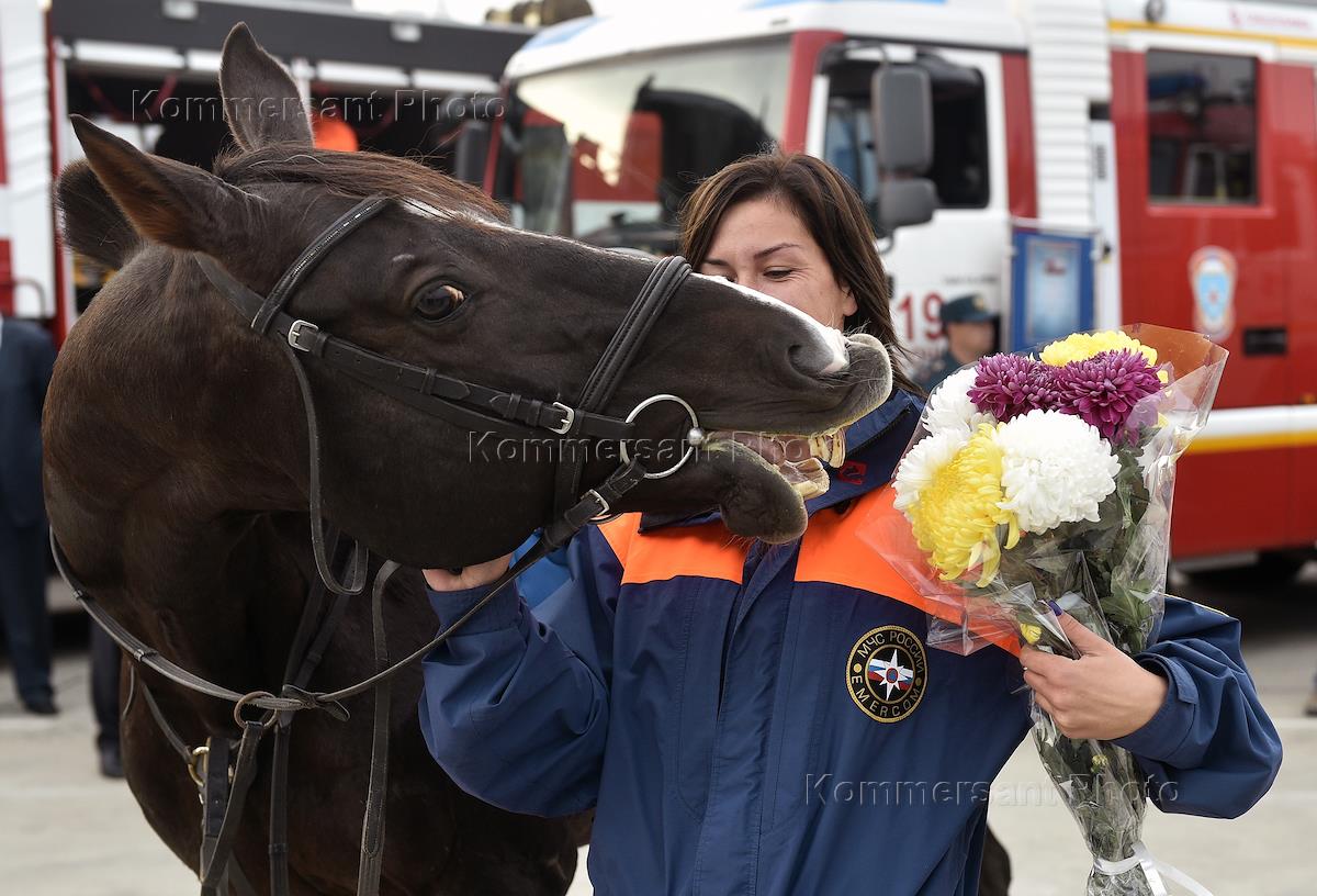 Учения подразделений МЧС России, связанные с тактико-специальной отработкой чрезвычайных ситуаций прошли в Сочи. Девушка с букетом цветов рядом с лошадью.