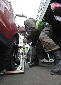 Эвакуация автомобиля погрузчиком во время пресс-тура "Задержание транспортных средств, создающих угрозу безопасности движения", организованный департаментом транспорта Москвы на улице Большая Якиманка.
