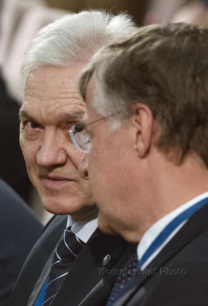 Член Совета директоров ОАО "НОВАТЭК" Геннадий Тимченко (слева) и председатель правления компании "Ферринг Фармасьютикал Групп" Фредерик Даг Арфст Паулсен (справа) во время XV съезда Русского географического общества. Съезд в Ломоносовском корпусе Московского государственного университета (МГУ) имени М.В.Ломоносова.