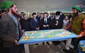 Председатель совета директоров ОАО "Газпром" Виктор Зубков (слева), председатель правительства России Дмитрий Медведев (третий слева), Патриарх Московский и всея Руси Кирилл (второй справа) и губернатор Московской области Андрей Воробьев (справа) осмотрели экспозицию музейно-выставочного комплекса "Новый Иерусалим" во время посещения Воскресенского Ново-Иерусалимского ставропигиального мужского монастыря.