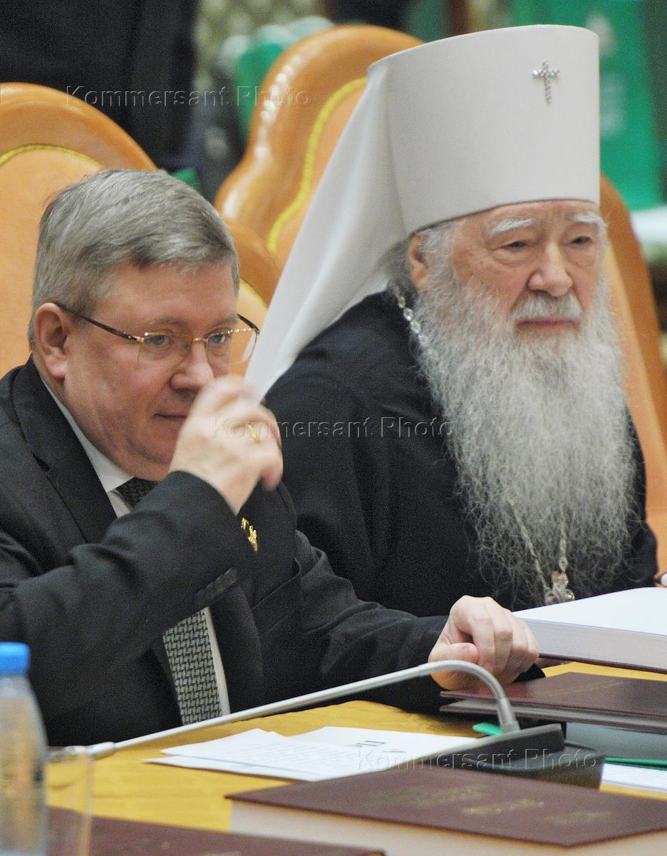 Первый заместитель председателя Совета Федерации России Александр Торшин (слева) и митрополит Крутицкий и Коломенский Ювеналий (справа) на церемонии открытия XVIII Всемирного Русского Народного Собора (ВРНС) по теме "Единство истории, единство народа, единство России" в зале церковных Соборов Храма Христа Спасителя.