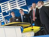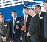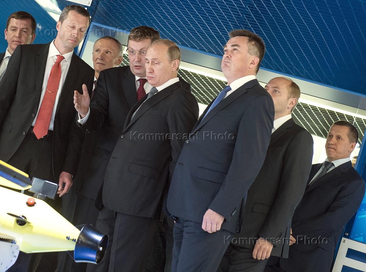 Рабочая поездка президента России Владимира Путина во Владивосток. Ректор Дальневосточного федерального университета Сергей Иванец (второй справа) и президент России Владимир Путин (справа) во время осмотра новых транспортных и роботизированных технологий в центре компетенций ОАО "Концерн Моринформсистема-Агат", который находится на территории Дальневосточного федерального университета.
