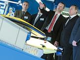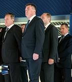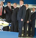 Рабочая поездка президента России Владимира Путина во Владивосток. Ректор Дальневосточного федерального университета Сергей Иванец (слева), президент России Владимир Путин (третий слева) и губернатор Приморского края Владимир Миклушевский (справа) во время осмотра новых транспортных и роботизированных технологий в центре компетенций ОАО "Концерн Моринформсистема-Агат", который находится на территории Дальневосточного федерального университета.