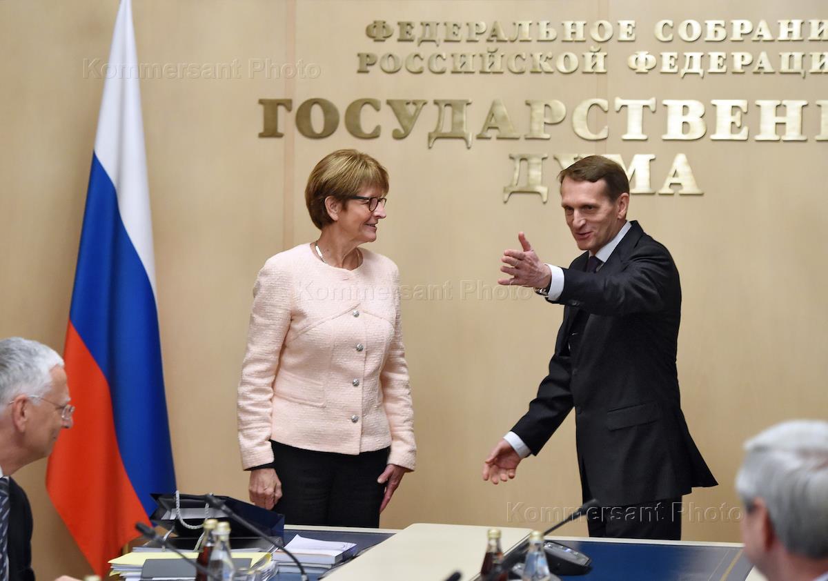 Встреча председателя Государственной думы России Сергея Нарышкина с членами Президентского комитета Парламентской ассамблеи Совета Европы (ПАСЕ) прошла в Госдуме России. Председатель ПАСЕ Анн Брассер (слева) и председатель Государственной думы России Сергей Нарышкин (справа) во время встречи.