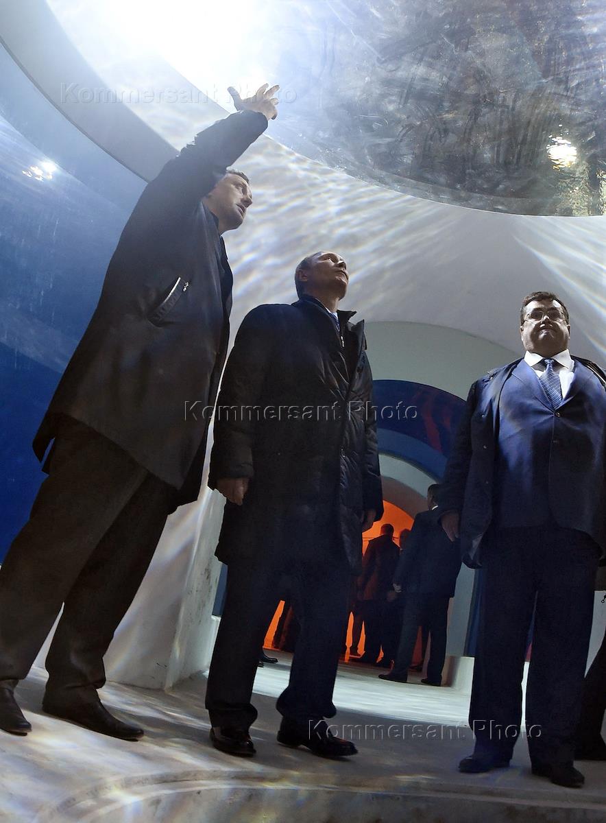Рабочая поездка президента России Владимира Путина во Владивосток. Слева направо: директор ФГУП "Дирекция по строительству Приморского океанариума в городе Владивосток" Управления делами президента России Андрей Поплавский, президент России Владимир Путин и директор института биологии моря Дальневосточного отделения Российской академии наук (РАН), Научный руководитель проекта Приморского океанариума Дальневосточного отделения РАН Андрей Адрианов во время посещения океанариума.