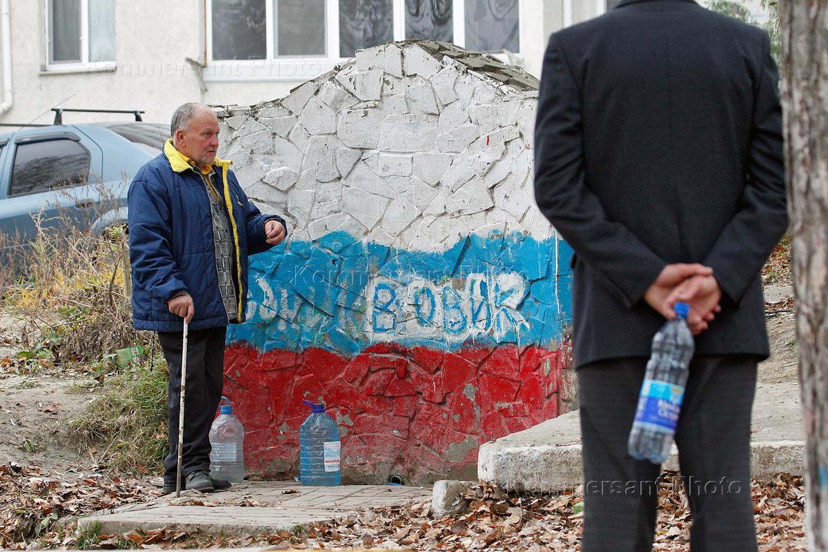 Беженец из Донецкой области (Авдеевка) Равиль Аржуханов (в центре) во время рыбалки на пирсе.