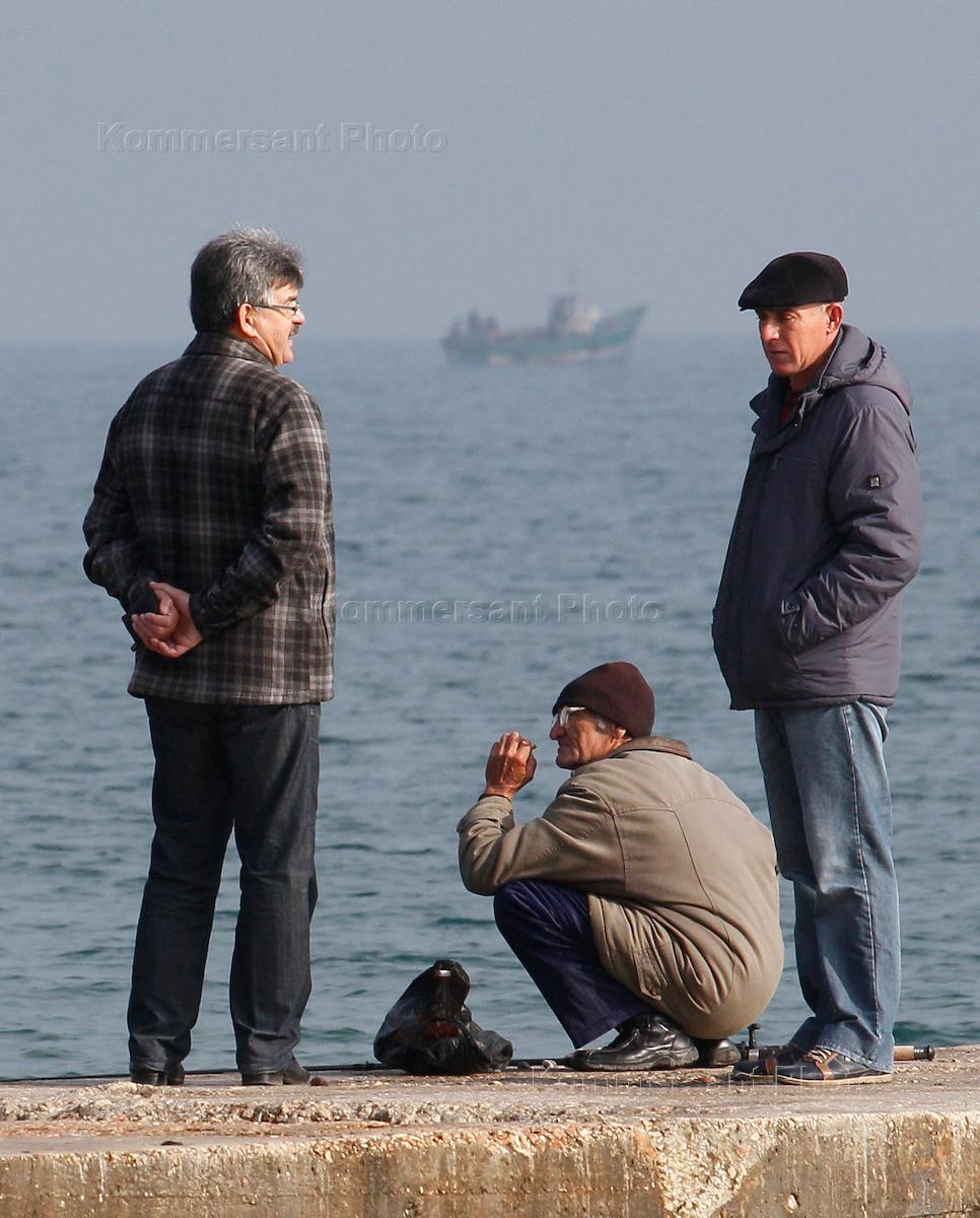 Беженец из Донецкой области (Авдеевка) Равиль Аржуханов (в центре) во время рыбалки на пирсе.