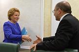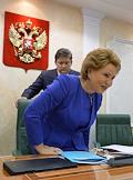 Председатель Совета Федерации России Валентина Матвиенко (слева) и президент Ассоциации российских банков Гарегин Тосунян (справа) во время заседания Межрегионального банковского совета на тему "Пути повышения эффективности банковской системы России". Заседание прошло в Совете Федерации России.