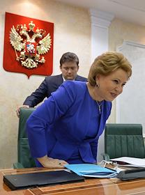 Председатель Совета Федерации России Валентина Матвиенко во время заседания Межрегионального банковского совета на тему "Пути повышения эффективности банковской системы России". Заседание прошло в Совете Федерации России.