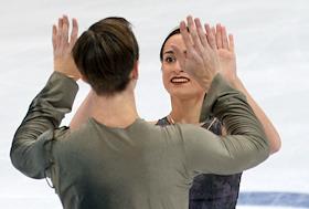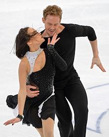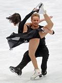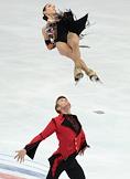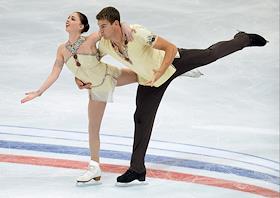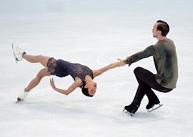 Гран-при по фигурному катанию на коньках "Кубок Ростелеком". Фигуристы из России Евгения Тарасова и Владимир Морозов во время выступления в произвольной программе спортивных пар. Соревнования прошли на Малой спортивной арене (МСА) "Лужники".