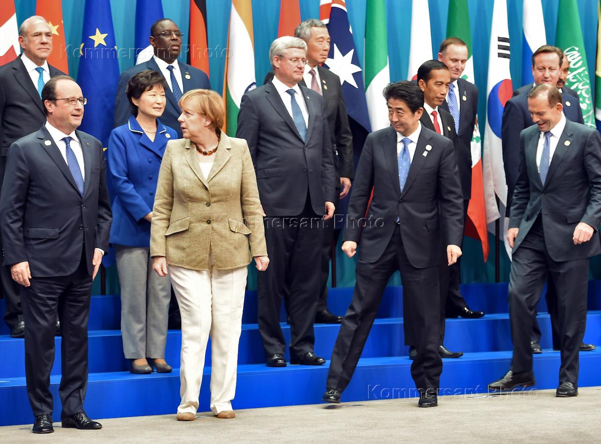 Саммит G20 в Брисбене. Слева направо на переднем плане: президент Франции Франсуа Олланд, федеральный канцлер Германии Ангела Меркель, премьер-министр Японии Синдзо Абэ и премьер-министр Австралии Тони Эббот на церемонии совместного фотографирования глав делегаций государств-участников саммита "Группы двадцати", приглашенных государств и международных организаций.