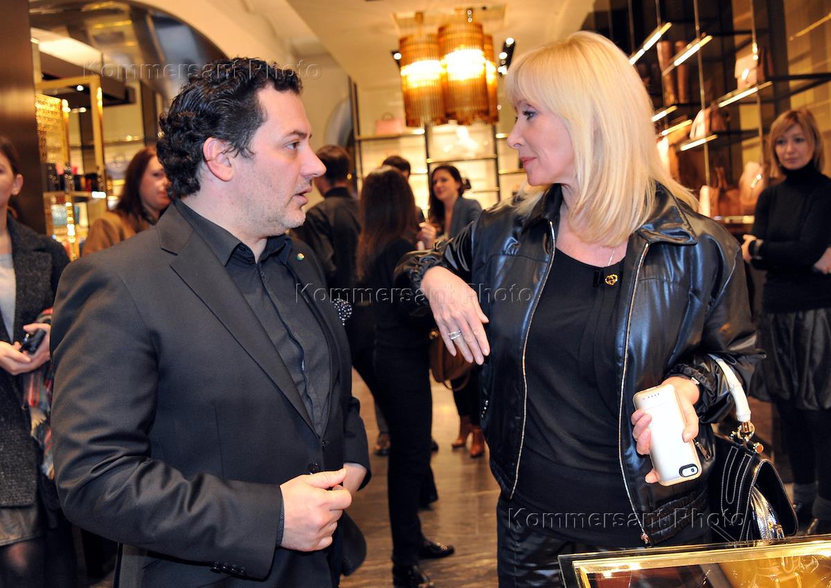 Управляющий директор ОАО "Торговый Дом ГУМ" Теймураз Гугуберидзе (слева) и телеведущая Оксана Пушкина (справа) на церемонии открытия бутика Gucci в Главном универсальном магазине (ГУМ).
