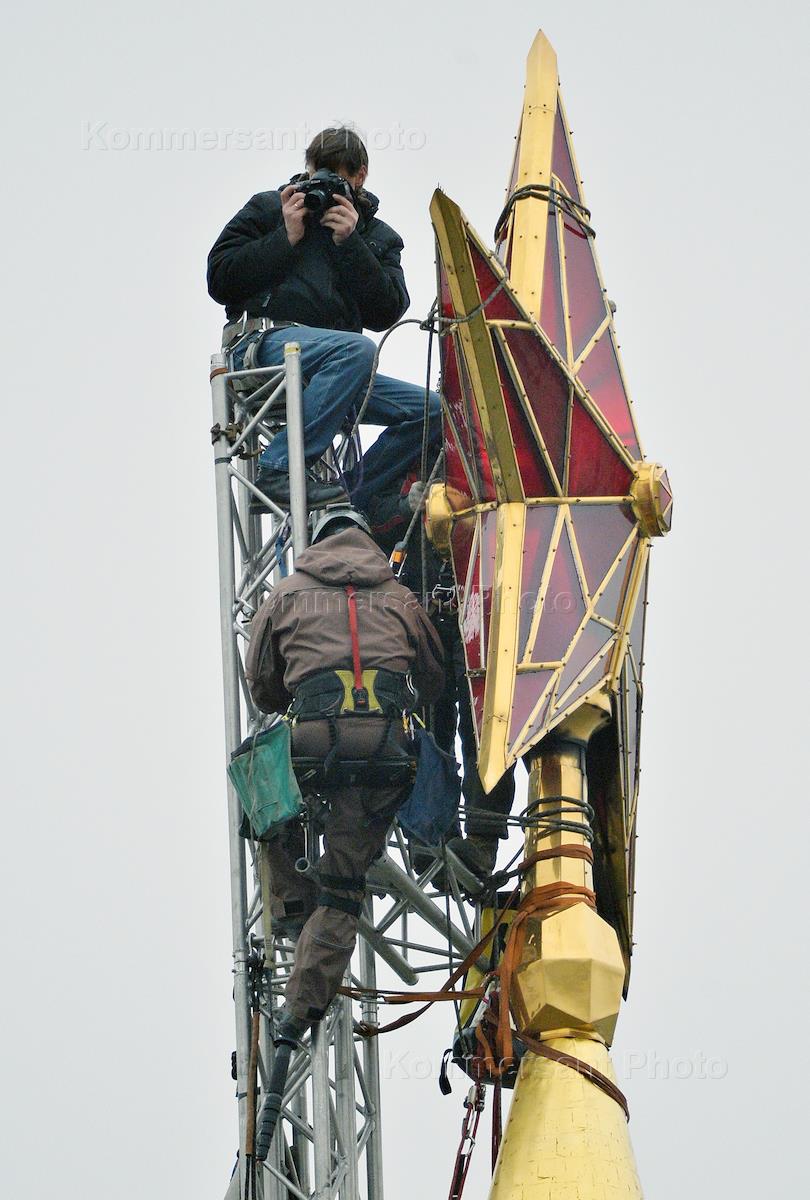 Профилактические работы монтажников-высотников на Водовзводной башне Московского Кремля.