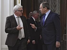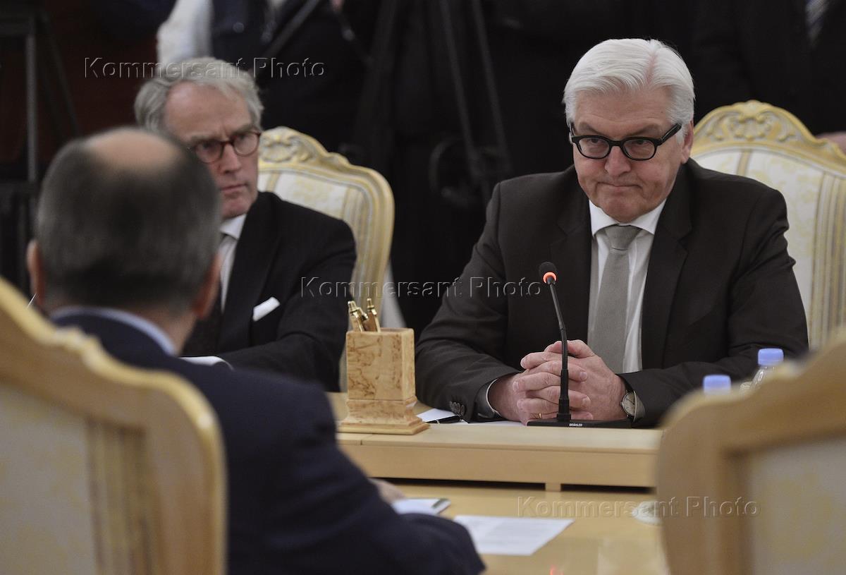 Министр иностранных дел Германии Франк-Вальтер Штайнмайер (справа) во время официальной встречи с министром иностранных дел России Сергеем Лавровым. Встреча прошла в особняке МИД России.