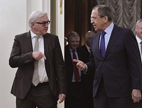 Министр иностранных дел Германии Франк-Вальтер Штайнмайер (слева) и министр иностранных дел России Сергей Лавров (справа) во время официальной встречи. Встреча прошла в особняке МИД России.