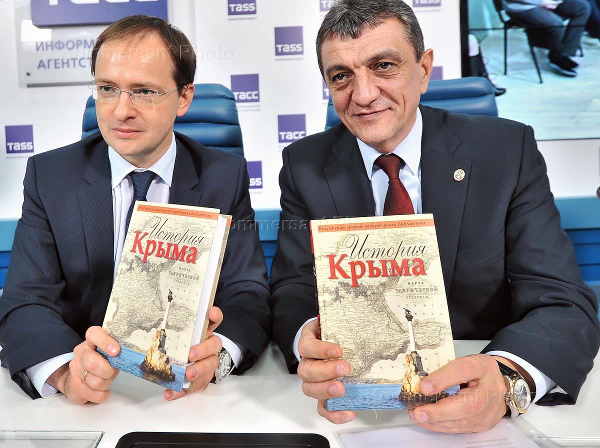 Министр культуры России Владимир Мединский (слева) и губернатор Севастополя Сергей Меняйло (справа) на пресс-конференции, посвященной презентации первой в истории современной России книги по истории Крыма. Пресс-конференция прошла в пресс-центре ИТАР-ТАСС.