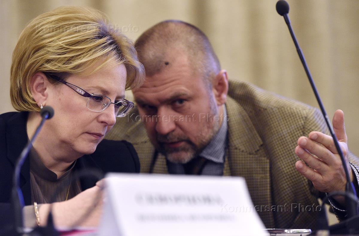 Председатель Совета при президенте России по развитию гражданского общества и правам человека Михаил Федотов (слева) и министр здравоохранения России Вероника Скворцова (справа) во время специального заседания Совета по правам человека при президенте России "Право граждан на охрану здоровья: проблемы и перспективы". Заседание прошло в здании Администрации президента России.