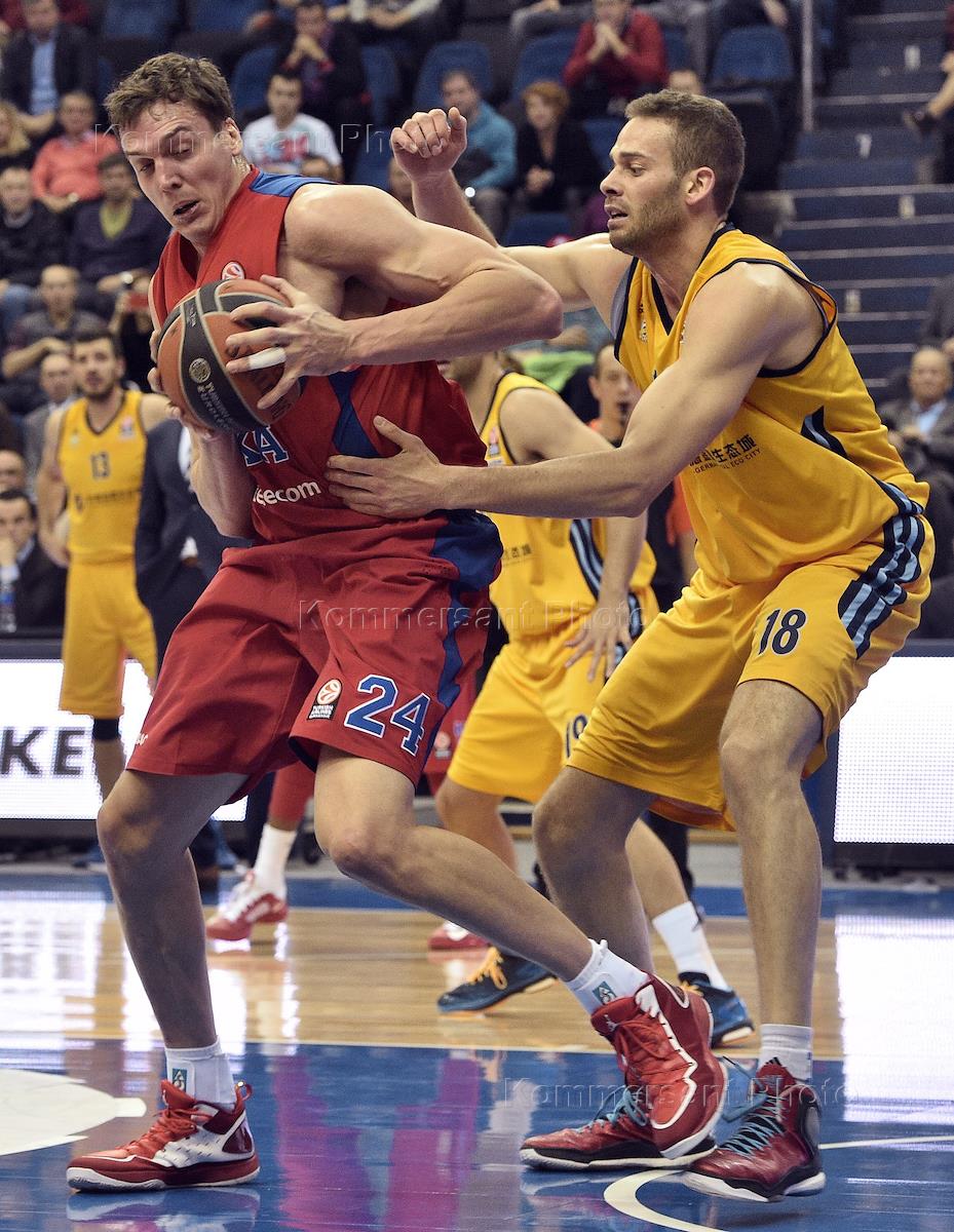 Евролига по баскетболу. Игрок БК ЦСКА (Москва) Александр Каун (слева) и игрок БК "Альба" Марко Банич (справа) во время матча между командами ЦСКА (Москва) и "Альба" (Германия, Берлин) на УСК ЦСКА.