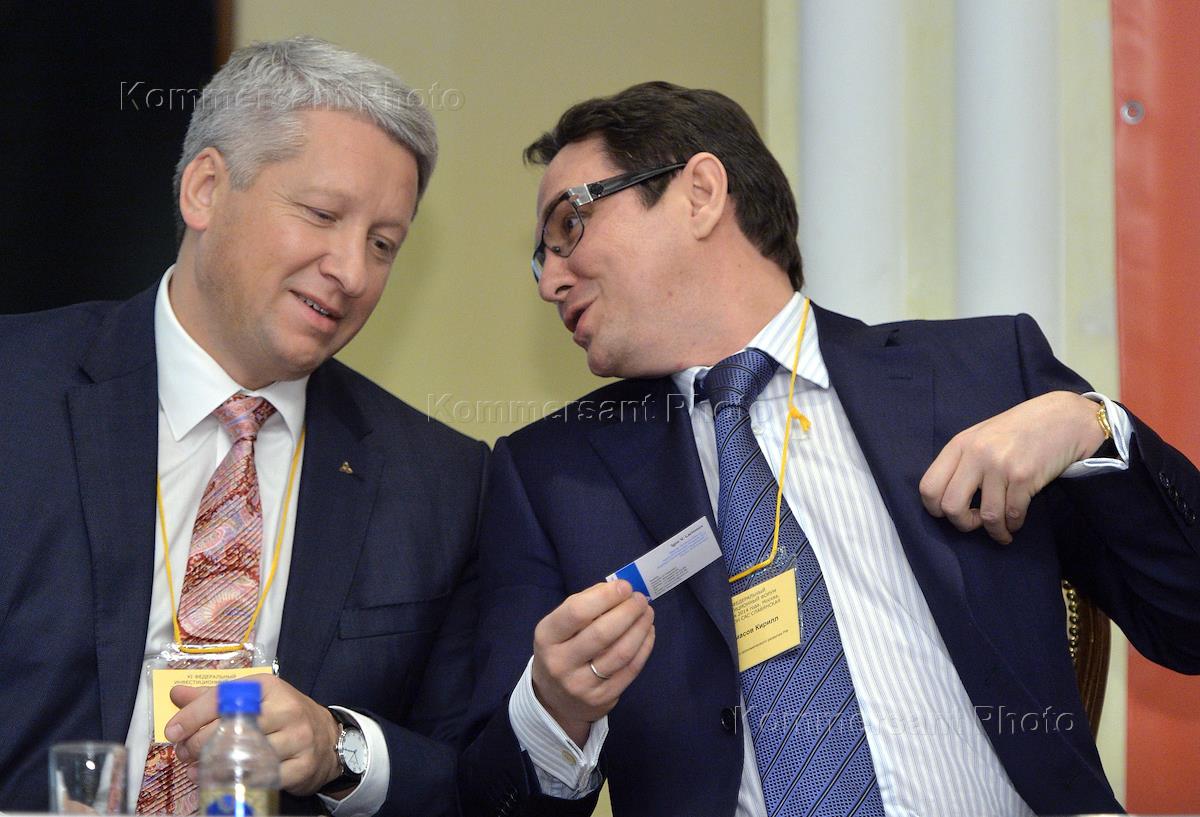 XI Федеральный инвестиционный форум прошел в отеле "Рэдиссон САС Славянская". Заместитель генерального директора Нижнекамскнефтехим Игорь Ларионов (слева) и советник министра экономического развития России Кирилл Тремасов (справа) во время форума.