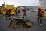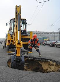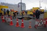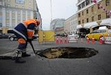 Сотрудники коммунальных служб города во время устранения провала грунта на улице Балчуг.