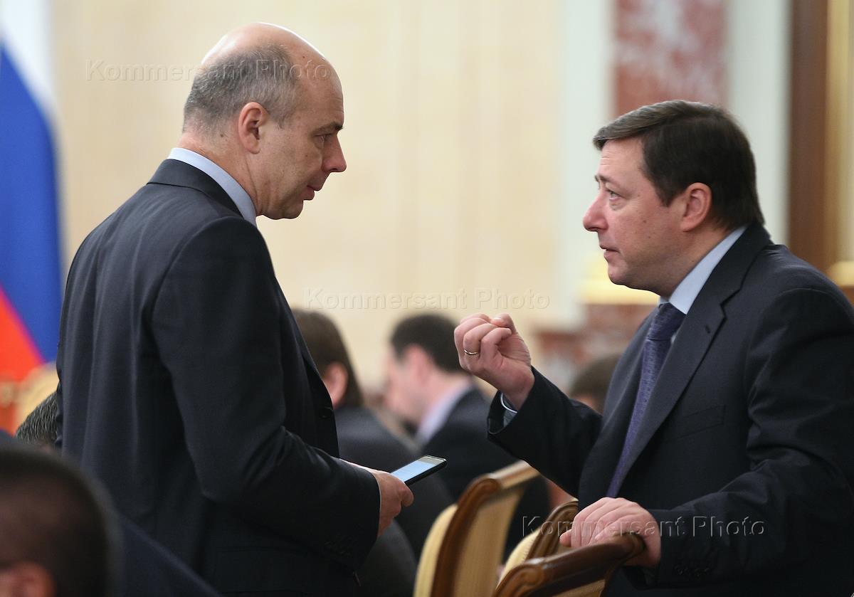 Министр экономического развития России Алексей Улюкаев (cлева) и министр финансов России Антон Силуанов (справа) во время совещания председателя правительства России с членами кабинета министров в Доме правительства России.