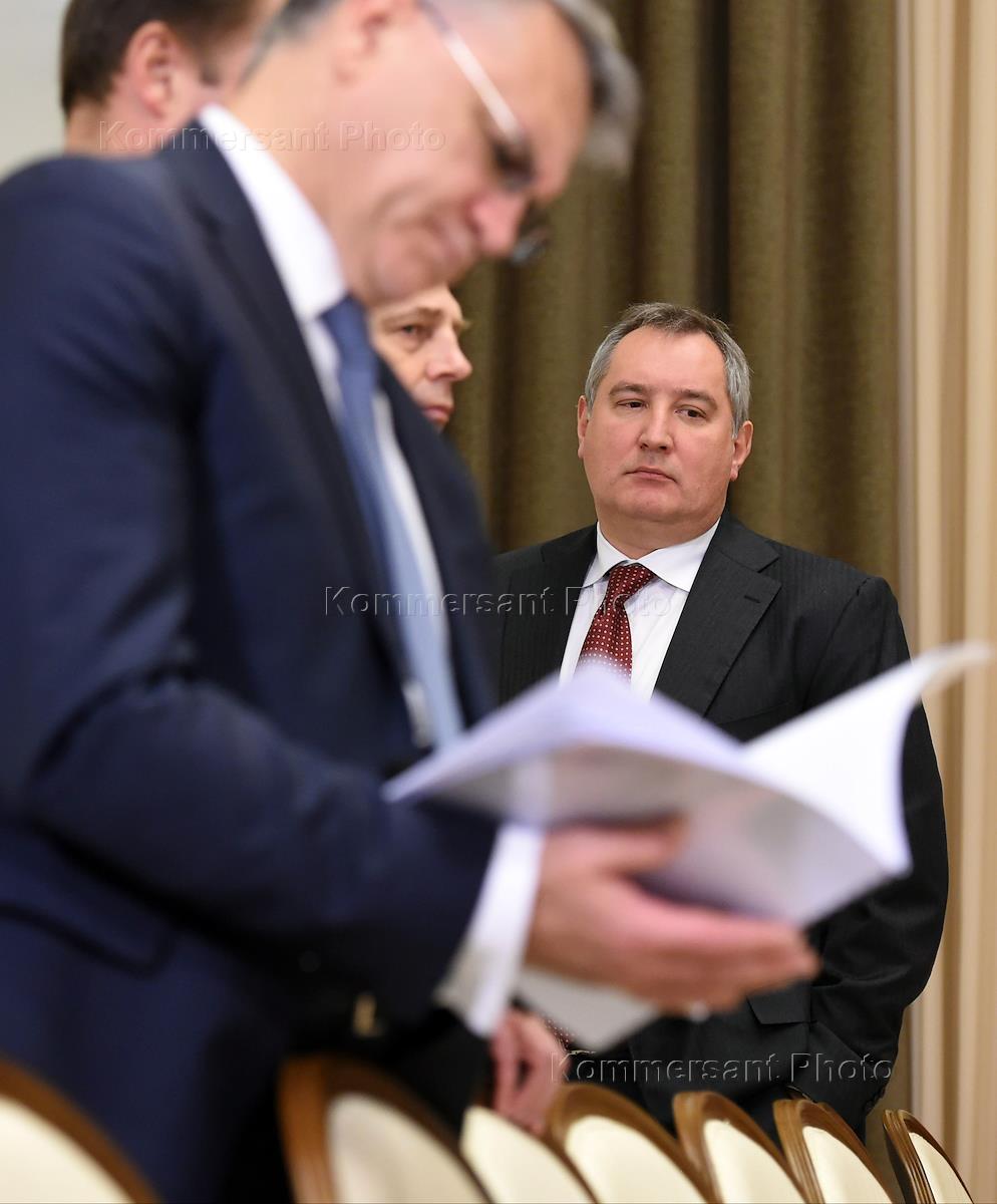 Рабочая поездка президента России Владимира Путина в Сочи. Руководитель Федерального космического агентства (Роскосмоса) Олег Остапенко (в центре) и заместитель председателя правительства России Дмитрий Рогозин (cправа) перед началом совещания по вопросам развития оборонно-промышленного комплекса в резиденции "Бочаров Ручей".