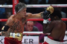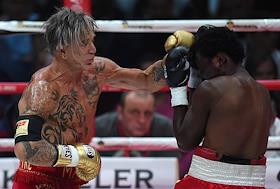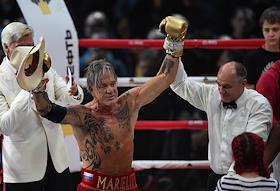 Американский актер и боксер Микки Рурк (справа), вернувшийся в профессиональный бокс, после поединка по боксу с американским боксером Элиоттом Сеймуром в ГКЦЗ "Россия" в Лужниках. Микки Рурк победил нокаутом.