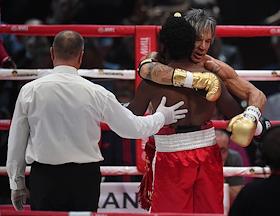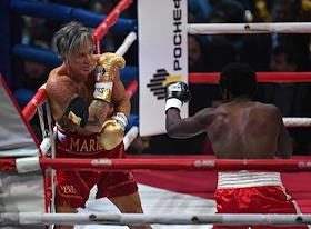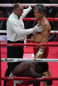Американский актер и боксер Микки Рурк (справа), вернувшийся в профессиональный бокс, и американский боксер Элиотт Сеймур (в центре) во время поединка по боксу в ГКЦЗ "Россия" в Лужниках. Микки Рурк победил нокаутом.