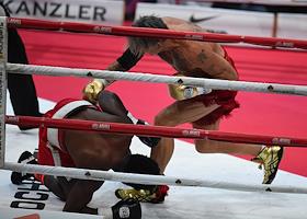 Американский актер и боксер Микки Рурк (слева), вернувшийся в профессиональный бокс, и американский боксер Элиотт Сеймур (справа) во время поединка по боксу в ГКЦЗ "Россия" в Лужниках. Микки Рурк победил нокаутом.