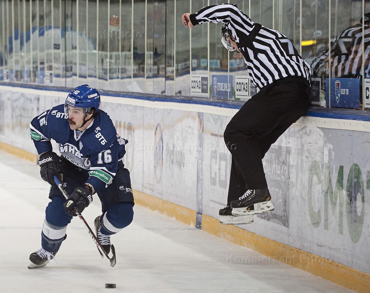 Игрок "Динамо" Даугавиньш Каспарс во время матча регулярного чемпионата Континентальной хоккейной лиги между ХК Динамо (Москва) и ХК ЦСКА (Москва).