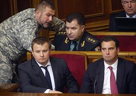 Премьер-министр Украины Арсений Яценюк (слева) и президент Украины Петр Порошенко (справа) на заседании Верховной Рады Украины.