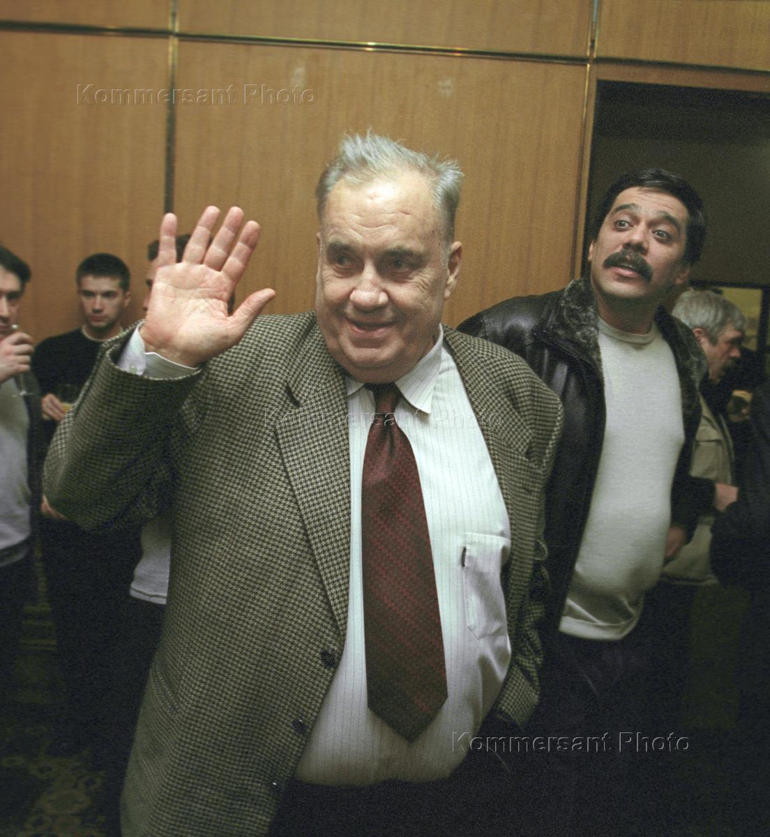 Режиссер Эльдар Рязанов (слева) и президент Фонда "Триумф" Игорь Шабдурасулов (справа) на пресс-конференции, посвященной вручению кинопремии "Ника", в отеле "Рэдиссон-Славянская".