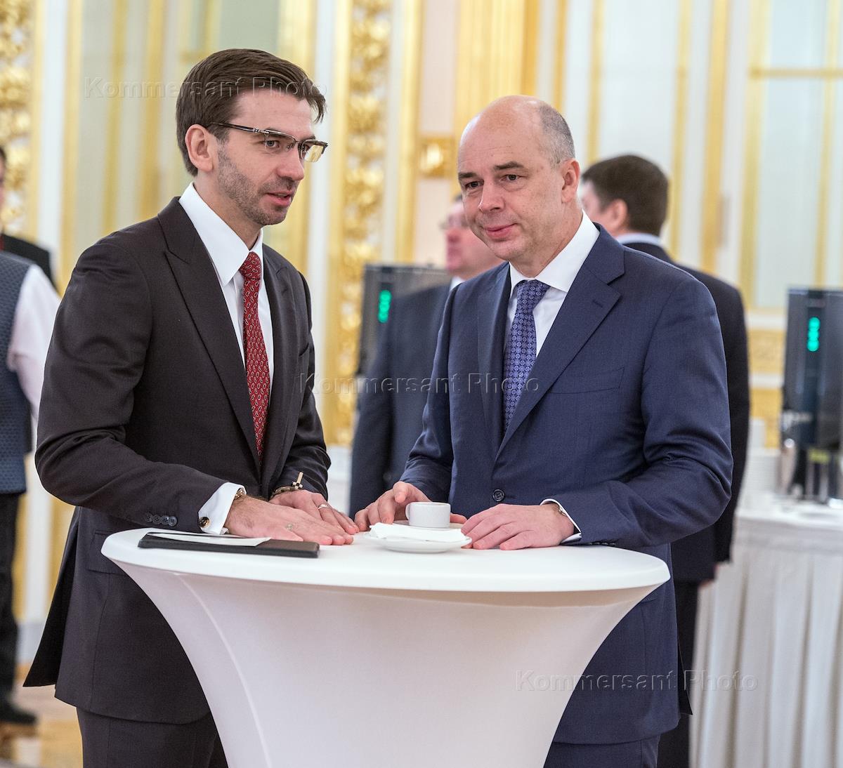 Министр России по связям с Открытым правительством Михаил Абызов (слева) и министр финансов России Антон Силуанов (справа) во время ежегодного послания президента России к Федеральному собранию в Кремле.